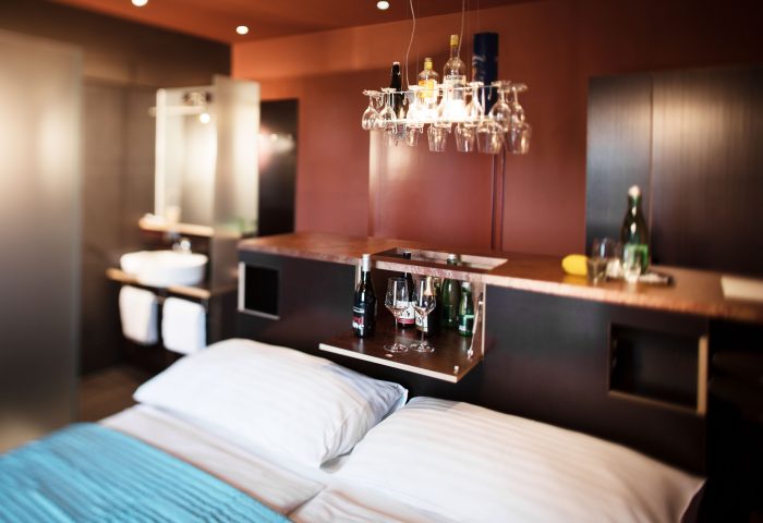 „Tschecheranten“ wohnen in der Minibar auf 14 m². Das Betthaupt ist der Bartresen die Barhocker stehen für die Nacht bereit.