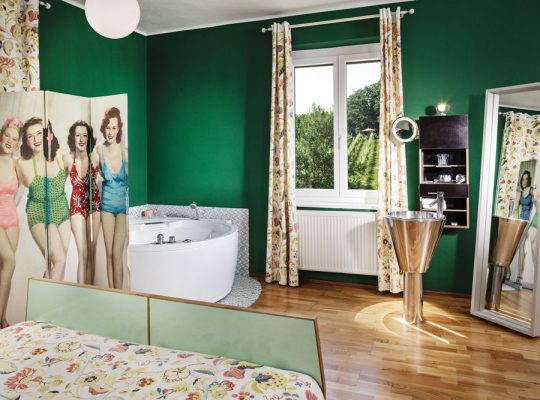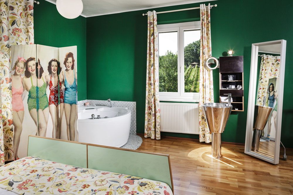 Es grünt so grün. Lässiges Retro Eck – Zimmer mit Originalmöbel aus den 60ern. Viel Licht und Luft mit 2 Fenstern, Richtung Süd & West plus Balkon und Whirlpool im Zimmer, du wohnst mit den Pin up Girls auf ca. 30m².
